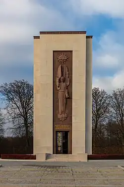 An der Westfassade ist das Wappen des Großherzogs von Luxemburg angebracht, darüber die Übersetzung des Widmungstextes ins Französische. Über dem Eingang steht die Skulptur eines Engels, der in der linken Hand einen Lorbeerkranz hält und die linke Hand zum Segen erhoben hat, über ihm in den Wolken fliegt eine Taube. Unterhalb der Skulptur ist im Fenstersturz der Tür folgender Satz eingemeißelt: