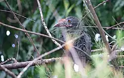 Der Schnabel ist braun mit einem hornfarbenen Schnabelhorn und blassgelben oder rosafarbenen Furchen über Ober- und Unterschnabel. Die nackte Haut rund um die Augen und der unbefiederte Kehlfleck sind rosa. Die Augen sind dunkelrot. Die Beine und Füße sind dunkelbraun.[2]