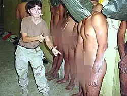Ein Foto zum Beispiel zeigt England lächelnd im Vordergrund, eine Zigarette im Mundwinkel, während sie auf den Penis eines bis auf einen über den Kopf gezogenen Sack nackten, zum Masturbieren gezwungenen Gefangenen zeigt und einen „Daumen hoch“ gibt.[3] Ein weiteres Foto beispielsweise zeigt England mit einer Hundeleine in der Hand. Am anderen Ende der Leine ist ein nackter, auf dem Boden liegender Mann zu sehen.