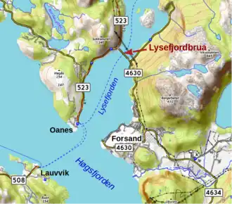 Bis zum Bau der Brücke war der Westteil der ehemaligen Kommune Forsand (seit 2020 Bestandteil der Kommune Sandnes) nur über eine Fähre zwischen den Ortschaften Forsand und Oanes erreichbar, wo Anschluss an die norwegische Reichsstraße 13 (Riksvei 13) bestand. Die einen Großteil der Kommune einnehmende Gebirgslandschaft Frafjordheiene, zwischen dem Lysefjord im Norden, dem Høgsfjord im Westen und dem Frafjord sowie dem Tal Hunnedalen im Süden, ist schwach besiedelt und nur die äußeren Küstenbereiche und angrenzenden Täler durch Straßen erschlossen. In der Kommune Forsand lebten zwar nur etwa 1000 Einwohner, aber schon 1975 gab es erste Bestrebungen zum Bau einer permanenten Straßenanbindung über den Lysefjord. Mit dem Bau des Tjodan-Kraftwerks mit seinen Stauseen im Osten in den 1980er Jahren generierte die Kommune Einnahmen um die Pläne voranzubringen. Die norwegische Straßenverkehrsbehörde Statens vegvesen begann dann 1993 in Zusammenarbeit mit dem Ingenieurbüro Aas-Jakobsen mit der Planung und dem Bau der Lysefjordbrücke, ausführendes Unternehmen war unter anderen AS Betong aus Rogaland. Als finaler Standort wurde eine Engstelle des Fjordes etwa 2,5 Kilometer von der Fährverbindung gewählt; da die Pfeilererrichtung in dem bis zu 500 Meter tiefen Fjord nur am Ufer möglich war, kam als Konstruktion eine Hängebrücke zur Anwendung. Die Kosten einschließlich der Straßenanbindung beliefen sich auf 205 Millionen Norwegische Kronen, wobei sich die Kommune Forsand mit einem Anteil von 62 Millionen NOK beteiligte;[1] die Baukosten der Brücke selbst betrugen 150 Millionen NOK.[2] Nach vier Jahren Bauzeit konnte die Lysefjordbrücke am 18. Dezember 1997 eröffnet werden. Die Fährverbindung Oanes–Forsand–Lauvvik ließ sich danach auf die Strecke über den Høgsfjord zwischen Oanes und Lauvvik verkürzen, verlor aber mit der Verlegung des Riksvei 13 über die neue Route durch den 2019 eröffneten Tunnel Ryfast nach Stavanger an Bedeutung und wurde privatisiert (heute Provinzstraße 523).[3]