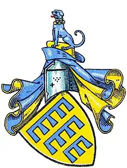 Blasonierung: In Gold drei blaue Turnierkragen von fünf, vier und drei Latzen übereinander. Auf dem Helm mit blau-goldenen Helmdecken ein goldener blauaufgeschlagener Hut, auf dem ein blauer Hund mit goldenen Halsband, an dem drei goldene Schellen hängen, nach rechts gewandt sitzt.[14]