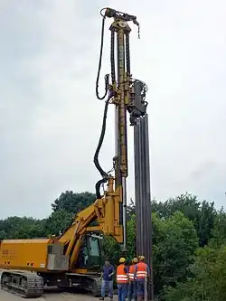 - Am häufigsten kommt der Anbaumäkler zum Einsatz. Er besteht meist aus Gittermast- oder Kastenprofilen und ist an einem ausreichend schweren und leistungsfähigen Trägergerät (Hydraulikbagger oder Seilbagger jeweils mit Raupenunterwagen) befestigt. Diesen Mäklertyp gibt es entweder als Starrmäkler oder als Teleskopmäkler.
