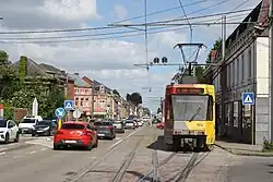 Zwei Stumpfgleise an einem Mittelbahnsteig, parallel dazu ein Abstellgleis, weist die Endstation Faubourg de Bruxelles der Linie M3 in Gosselies auf. Südlich der Station teilt sich die zweigleisige Strecke bis zur Station Carrosse, wobei das stadtauswärtige Gleis durch die schmale Rue de Jumet führt, das Gleis in Richtung Charleroi auf einer aufgelassenen Eisenbahntrasse liegt.[39] Ein Betriebsgleis kurz vor dem Endbahnhof erlaubt in seiner Funktion als Spange zwischen den beiden Richtungsgleisen, ggf. unter Umgehung des Endbahnhofs vor jenem zu wenden.