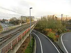 Auf Teilen der Trasse einer stillgelegten Eisenbahnstrecke (Linie 140A)[16] zwischen dem ehemaligen Bahnhof Charleroi-Nord und Châtelet wurde ein weiterer Streckenast der Stadtbahn angelegt. Der Abschnitt Waterloo–Centenaire mit den vier Stationen Neuville, Chet, Pensée und Centenaire war im Jahr 1987 betriebsbereit, wurde aber dann nicht im Linienverkehr benutzt. Die darüber hinaus fertig trassierte Strecke hatte keine Gleise, aber die Rohbauten der zwei Stationen Champeau und Roctiau[Anm. 2]. Sie endete mit einem mehrere hundert Meter langen, ungenutzten Rohbautunnel im Bereich der Stadtgrenze Charleroi–Châtelet.