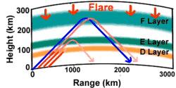Die erhöhte Elektronendichte führt zu erhöhter Dämpfung in der D-Schicht (mattes Rot) bis hin zum totalen Signalverlust oder ungewöhnlicher Brechung an der E-Schicht.
