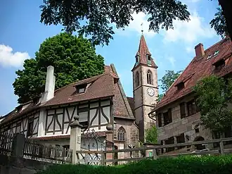 - Das „Hallerschloss“ (Kirchenberg 7–11) ist im südwestlichen Teil ein Wohnturm mit Schlitzfenstern aus dem 13./14. Jahrhundert, der in der frühen Neuzeit östlich erweitert und um 1500 mit Fachwerk aufgestockt wurde. Wohl Ende des 17. Jahrhunderts verlor das hohe Gebäude sein Walmdach und erhielt ein Satteldach und Giebelscheiben aus Fachwerk. Im 13. Jahrhundert hatten die zollerischen Burggrafen von Nürnberg die ehemaligen Reichsministerialen von Lauffenholtz (Laufamholz) verdrängt und die Rechte an der kleinen Burg auf dem früheren Königshof für sich reklamiert. Allerdings behielten die Laufamholzer bis zu ihrem Aussterben 1568 Lehnsrechte in Mögeldorf.[21] In der 2. Hälfte des 15. Jahrhunderts erwarb Hans Tetzel den Sitz; er musste sich 1482 verpflichten, die Behausung zu Mögeldorf, die er im Einverständnis mit dem Nürnberger Rat „auffzurichten und zu pauen furgenommen und des ytzo in dem paw stee“, künftig nur an Nürnberger Bürger zu verkaufen, weil der Rat kein Offenhaus der Hohenzollern vor den Toren der Stadt haben wollte. Das Feste Haus kam dann aber 1515 an die Augsburger Unternehmer Anton und Lukas Grander, wohl als Handelsniederlassung außerhalb der Reichsstadt, von denen es Hieronymus Rehlinger, ebenfalls Augsburger Unternehmer, erwarb. Dieser verkaufte es 1555 an Wolf VIII. Haller von Hallerstein, Reichspfennigmeister Kaiser Karls V. (1492–1559) und damit an ein Nürnberger Patriziergeschlecht. 1666 fiel es durch Heirat an den Altdorfer Pfleger Georg Andreas Imhoff, dessen Familie es für 140 Jahre behielt.