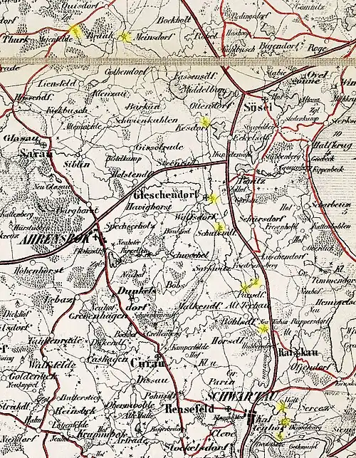 - ↑ Karte: Die Herzogthümer Holstein und Lauenburg, Hoffmann & Campe, Hamburg 1850.