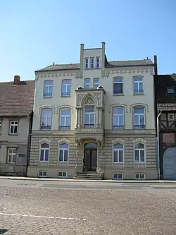 - Nr. 37: 3-gesch. verputztes Wohnhaus aus der Gründerzeit von um 1870 im historisieren Tudorstil (D) mit mittigem Erker und Dachhaus, nach 1995 saniert