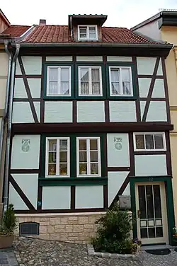 Das schlichte zweigeschossige Fachwerkhaus wurde in der Zeit um das Jahr 1800 gebaut. Bemerkenswert sind zweimal drei in die Ausmauerung der Gefache eingefügte Ziegel, die vermutlich nach einer anderen Verwendung hier wiederverwendet wurden. Die drei Ziegelsteine weisen als Abdrücke halbierte Fächerrosetten auf. Noch für die 1990er Jahre wurden drei dieser Steine oberhalb der Haustür beschrieben, sind nun jedoch links und rechts der Fenster des Erdgeschosses erkennbar.