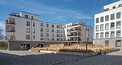 Im Jahr 2003 startete in Mülheim an der Ruhr das strategische Stadtentwicklungsprojekt „Ruhrbania“ unter dem Motto „Stadt an den Fluss“. Ein zentraler Baustein dieser Strategie ist das Ruhrquartier[6] gleich neben dem Mülheimer Rathaus: Das Projekt besteht aus drei klar gegliederten Baukörpern mit Eigentums- und Mietwohnungen sowie Gewerbe- und Gastronomieflächen und verbindet die Mülheimer Innenstadt mit der Ruhrpromenade.