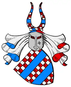 Das Stammwappen zeigt in von Rot und Silber geschachtem Schild zwei blauen Balken (auch auf Blau zwei von Rot und Silber geschachte Balken). Auf dem Helm mit rechts blau-silbernen und links rot-silbernen Decken zwei wie der Schild bezeichnete Büffelhörner.