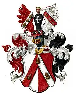 - Wappen 1745 und 1794: Geviert, 1 und 4 das Stammwappen, 2 und 3 in Blau zwei schräg gelegte, mit drei goldenen Ringen zusammengehaltene und an den Enden auswärts gebogene goldene Stäbe (Maueranker). Zwei Helme, auf dem rechten mit rot-silbernen Decken das Kleinod des Stammwappens, auf dem linken mit blau-goldenen Decken zwischen goldenem und blauem Flügel der Maueranker.