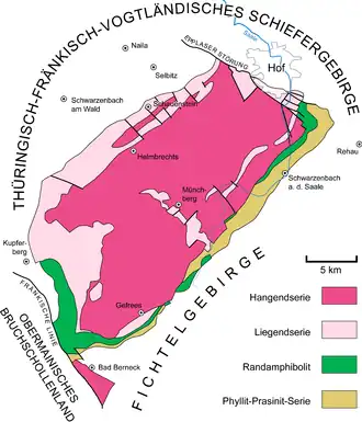 bezeichnet werden. Hierbei ist die tektonostratigraphisch höchste Einheit – die Hangendserie – die Einheit mit den höchstgradig metamorphen Gesteinen und die tektonostratigraphisch tiefste Einheit – die Phyllit-Prasinit-Serie – die Einheit mit den niedrigstgradig metamorphen Gesteinen. Man spricht daher auch von einer „inversen Zonierung“. Der gesamte Stapel lagert wiederum auf den un- oder schwachmetamorphen Einheiten der sogenannten „Bayerischen Fazies“ des Thüringisch-Fränkisch-Vogtländischen Schiefergebirges.