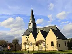 Die spätgotische dreischiffige Hallenkirche wurde im Wesentlichen um 1300 erbaut. Lediglich Steinkanzel und Turmspitze stammen aus dem 16. Jahrhundert. Der aus der ersten Hälfte des 13. Jahrhunderts stammende Taufstein bildet das älteste Element der Kirche.[20]