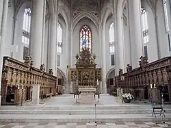 Der Chor ist so breit wie das dreischiffige Langhaus, aber doch kein Umgangschor; das trapezförmige östlichste Joch des Mittelschiffs reicht bis an das Chorscheitelfenster.