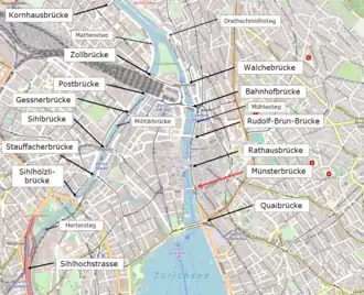 - ↑ a b Richard Heierli, Fritz Hirt, Heinrich Hofacker, Willi Hofmann, Urs Schneider, Erich Möschler: Quaibrücke Zürich. In: Schweizer Ingenieur und Architekt, 10/1985, S. 183