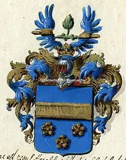 Das Adelsdiplom im Österreichischen Staatsarchiv zeigt die Flügel zusätzlich belegt mit dem goldenen Balken und zwischen den Flügeln einen grünen balkenweis gestellten gestümmelten Ast, aus dem oben ein grünes Blatt wächst.[4] Der gestümmelte Ast kann als Referenz auf die Familie Flagingk angesehen werden, aus der die Ehefrau des Geadelten stammte.
