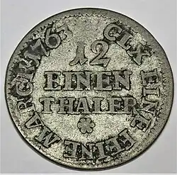 Auch Talerteilstücke die als Kurantmünzen ausgeprägt wurden, deren Nominalwert somit auch ihrem Silberwert entsprachen, konnten ihr Verhältnis zur Kölner Mark in der Umschrift nennen. Der sächsische 1/12 Taler von 1763 auf dem Foto nennt CLX EINE FEINE MARCK, 160 Stück dieser Teilstücke entsprachen somit in ihrer Summe dem Gewicht der Kölner Mark.