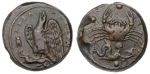 - ↑ Christian Leeck: Die Münzen der Tyrannen: Territorium und Einflussmacht der Polis Akragas in der Zeit der Emmenidenherrschaft (490/89-471 v. C.). AKRES Publishing e.K, 2022, ISBN 978-3-910347-00-7, S. 28.