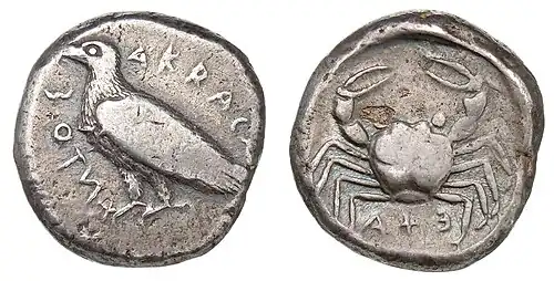Auf den Münzen von Akragas erscheint fast immer ein Adler auf der Vorderseite (Avers) und eine Krabbe auf der Rückseite (Revers). Diese Kombination der Münzbilder wurde im Verlauf des 5. Jahrhunderts zwar durch einige Symbole ergänzt und in Details abgeändert, galt jedoch seit dem Beginn ihrer Münzprägung ca. 525–510 v. Chr. bis zu ihrer Einstellung um das Jahr 406 v. Chr. als kontinuierliches Erkennungszeichen der Polis.[8] Im Gegensatz zur Münzprägung von Selinunt, welche zu Beginn mit einem vertieften Quadrat noch kein figürliches Bild auf den Rückseiten zeigte, startete Akragas unmittelbar mit dem Bild der Krabbe auf dem Revers. Dieses Vorgehen könnte von den korinthischen Geprägen übernommen worden sein, die auf Sizilien bereits weiträumig zirkulierten. Wissenschaftliche Analysen der sizilischen Hortfunde sowie akragantinische Überprägungen korinthischer Münzen belegen solch einen Einfluss, welcher von dem griechischen Festland ausging.[9]