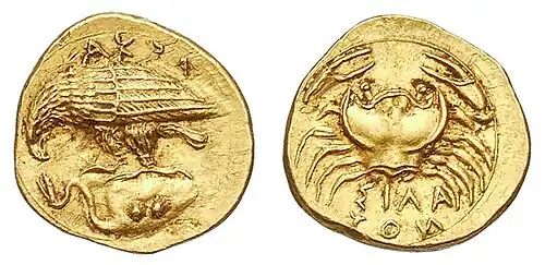 - ↑ Ulla Westermark: The coinage of Akragas (= Studia Numismatica Upsaliensia). Université d’Uppsala, Uppsala 2018, ISBN 978-91-513-0269-0, S. 43.