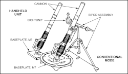 - M170A1: Gewicht: 5 kg,[2] Materialien: Aluminium und Titan. Durch den Einsatz von selbstschmierenden Materialien und Beschichtungen wurde die Wartung des Zweibeins vereinfacht, da die Gelenke nicht mehr geschmiert werden müssen. Die Beine rasten für die Gefechtsstellung wie auch den Transport ein, das Drahtseil entfiel. Zusätzlich wurde eine Wasserwaage in das Zweibein integriert, um beim waagrechten Ausrichten des Mörser zu unterstützen.[4]