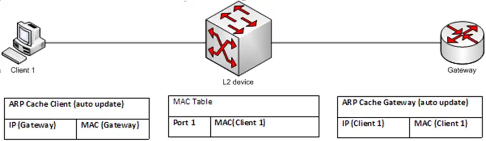 Möchte ein Gateway Daten zu einem Client über ein Layer-2-Gerät senden, liest das Gateway die zugehörige MAC-Adresse des Clients in seinem ARP-Cache aus. Das Datenpaket wird dann zum Layer-2-Gerät gesendet. In dessen MAC-Tabelle steht ein Eintrag an welchen Port das Paket übermittelt werden muss.