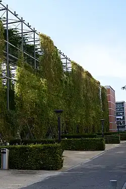 Mit der Anlage des Parks auf dem 0,9 ha grossen Grundstück wurde 2001 begonnen; er wurde 2002 eröffnet. Der zweite Teil des Gestaltungskonzepts, ein der offenen Hallenseite vorgelagerter Platz mit berankten Stelen, ist noch nicht ausgeführt. Das hierfür zum Abbruch bestimmte viergeschossige Backsteingebäude wird vorderhand weiter genutzt.[1]