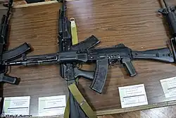 AKS-74U (russisch Автомат Калашникова Складной образца 1974 года Укороченный, transkr.: Avtomat Kalašnikova skladnoj obrazca 1974 goda Ukoročennyj, deutsch Automat Kalaschnikow klappbar Modell 1974 gekürzt). Bei dieser Waffe wurde nicht nur der Lauf auf 200 mm, sondern auch das Gassystem gekürzt. Dadurch erhielt man eine Waffe, welche die Abmessungen einer Maschinenpistole aufweist, aber die stärkere Mittelpatrone 5,45 × 39 mm verwendet. Bei der Kategorisierung ist sich die Fachwelt deswegen uneinig. In manchen Werken taucht sie als Maschinenpistole[25] auf, in anderen als Sturmgewehr.[30] Im Aufbau unterscheidet sich das AKS-74U vom AK-74 neben dem kurzen Lauf noch durch den Gehäusedeckel, der nicht abgenommen, sondern nach oben geklappt wird. Auch verfügt die AKS-74U nicht über ein Schiebevisier am Ende das oberen Handschutzes, sondern besitzt eine Klappkimme, die auf dem Gehäusedeck sitzt, um eine längere Visierlinie zu erhalten. Die Klappkimme hat eine Einstellung für Nahkampf markiert mit „П“ (transkr.: P) und eine für 400 bis 500 Meter, markiert mit „4–5“. Die effektive Reichweite liegt jedoch bei maximal 200 Metern. Um mit dem enormen Mündungsfeuer zurechtzukommen und die Funktionssicherheit trotz des kurzen Gassystems zu gewährleisten, besitzt das AKS-74U eine Expansionskammer als Mündungsaufsatz, von dessen Entfernung im Handbuch dringend abgeraten wird. Die Waffe wurde an die Besatzungen von Fahrzeugen ausgegeben und später, vor allem im sowjetisch-afghanischen Krieg, von Spezialeinheiten verwendet. Für verdeckte Operationen wurde der Schalldämpfer PBS-4 verwendet und ein spezielles Granatgerät mit der Bezeichnung BS-1 Beschina konnte verwendet werden. Das Granatgerät war schallgedämpft und verschoss 30-mm-Granaten mit Hilfe getrennter Treibladungskartuschen, die in einem Magazin untergebracht waren. Das Gerät wurde von vorne geladen. Vom AKS-74U gab es weitere für Spezialeinheiten optimierte Versionen. Das AKS-74UN besitzt eine Seitenmontage. Das AKS-74UB besitzt neben der Seitenmontage anstelle der Klappkimme ein Schiebevisier, an dem man die Flugbahn von Unterschallmunition besser einstellen kann. Lizenzen für das AKS-74U gingen nur selten ins Ausland. Aus diesem Grund schufen die meisten Ostblockländer ihre eigenen, meist etwas weniger stark gekürzten, Versionen einer kurzen Kalaschnikow.[25] Aktuell befinden sich noch viele AKS-74U im Gebrauch bei den russischen föderalen Streitkräften, diese sollen aber schrittweise durch das AK-105 ersetzt werden.[31]