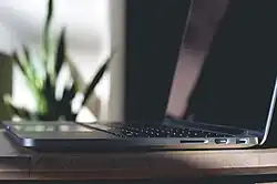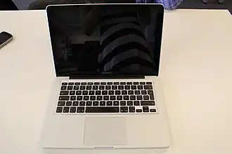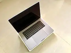 Das MacBook Pro (manchmal inoffiziell abgekürzt als MBP[1]) ist ein Macintosh-Notebook des Unternehmens Apple. Die Produktreihe wurde von Steve Jobs am 10. Januar 2006 auf der Macworld Expo vorgestellt. Die neuen Laptops lösten das 15- und 17-Zoll-Modell des PowerBook G4 ab. Das Design basiert auf dem von Jonathan Ive entwickelten Design der G4-PowerBooks. 2005 kündigte Apple an, von PowerPC-Prozessoren zu Intel-CPUs zu wechseln. Das MacBook Pro markierte den ersten mobilen Mac, der mit dem Core Duo einen Intel-Prozessor besaß.[2]