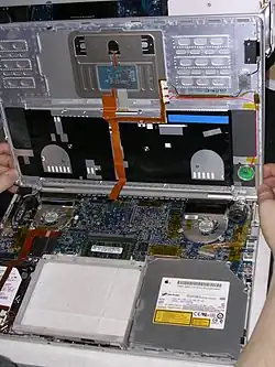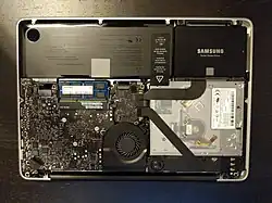 Ein geöffnetes MacBook Pro mit hochgeklappter Rückschale: links die Festplatte, rechts das CD/DVD-Laufwerk, in der Mitte der fehlende Akku (weiße Unterlage sichtbar), oberhalb davon zwei Lüfter.
