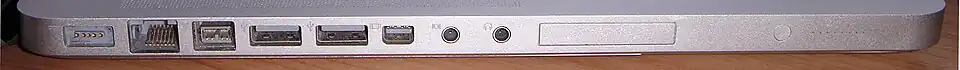 Eine weitere Neuerung ist der MagSafe-Ladeanschluss: Das Netzkabel wird nicht mehr mechanisch mit seinem Stecker im Notebook gehalten, sondern mit einem Magneten. Sollte man versehentlich am Stromkabel hängenbleiben, wird lediglich der Kontaktstecker abgezogen, ohne dass der Rechner mitgerissen oder der Stecker bzw. die Buchse beschädigt wird. Während das 15,4″-Modell zwei USB-Anschlüsse hat, verfügt das Notebook mit 17″-Bildschirm über drei USB-Anschlüsse und die beim kleineren Modell erst ab Oktober 2006 eingebaute FireWire-800-Schnittstelle. Für den Anschluss eines externen Bildschirms war ein DVI-auf-VGA-Adapter im Lieferumfang enthalten. Ein Mikrofon und zwei Lautsprecher sind eingebaut. Über die Anschlüsse können digitale Audiogeräte angeschlossen werden. In der Mitte des oberen Bildschirmrahmens befindet sich eine iSight-Kamera (mit 640 × 480 Pixeln Auflösung).