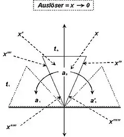 Ein perfekter geometrischer Kegel befindet sich, auf seiner Spitze stehend, im absoluten labilen Gleichgewicht. Die allerkleinste Einwirkung von außen wird ihn zum Umstürzen bringen. Doch so lange er noch steht, ist die Frage offen (= indeterminiert), welcher der potentiell absolut gleichwertigen, in unendlicher Anzahl vorliegenden Auslöser x, x′, x″ usf. tatsächlich zur Entfaltung kommt und – im Rahmen der naturgesetzlichen Determinismen – den ursprünglichen Zustand des Kegels von a0 zu a1, a1′, a1″ usf. verändert. Das Geschehen zwischen t0 und t1 an sich unterliegt also – nachdem sich ein Auslöser realisiert hat – wiederum gänzlich den naturgesetzlichen Determinismen.