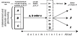 Gegeben ist das Kontrollzentrum einer efferenten Nervenbahn mit den Auslösepunkten A, B, C... Je nachdem, welcher Auslösepunkt aktiviert wird, sendet das Kontrollzentrum den Befehl a, b, c... an die Motilität, welche dann entsprechend die Aktion α, β, γ... ausführt. Wie beim Kegel wird es hernach nicht möglich sein, festzustellen, warum genau dieser Auslösepunkt aktiviert wurde, obwohl der Ablauf an sich komplett innerhalb der naturgesetzlichen Determinismen erfolgte.