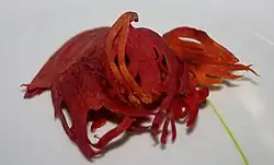 In einer reifen Frucht ist die Muskatnuss (der Samenkern) von einem leuchtend roten Samenmantel umhüllt, in dessen Schlitzen man die dunkle Schale der Muskatnuss sehen kann. Nach der Ernte werden die Samenmäntel in Handarbeit von den Muskatnüssen abgezogen.[8] Um das Gewürz Macis zu gewinnen, werden die Samenmäntel in der Sonne oder in Trockenräumen getrocknet und zwischendurch immer wieder flachgedrückt. Beim Trocknen wechselt die Farbe von Karminrot zu Orange bis Gelbbraun. Nach dem Trocknen sind die Samenmäntel etwa drei bis vier Zentimeter lang und etwa einen Millimeter dick.[9]
