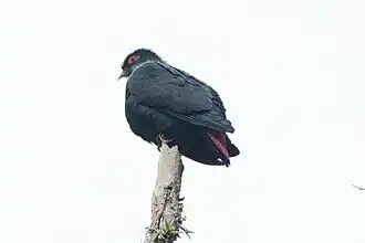 Junge Madagaskar-Fruchttauben sind grünlich blau gefärbt, ihnen fehlt zunächst jeglicher Rotanteil im Gefieder, wie es für adulte Vögel typisch ist.