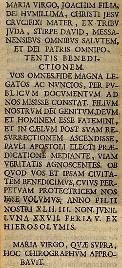 - „Maria die Jungfrau, Tochter Joachims, Gottes Allergeringste, Mutter Jesu Christi des Gekreuzigten, aus dem Stamm Juda, aus dem Wurzelstock Davids, entbietet allen Einwohnern von Messina Heil und den Segen Gottes, des allmächtigen Vaters.