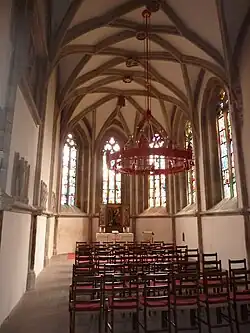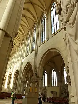 - Der Chor hat den Querschnitt einer Emporenbasilika, nach Vorbildern aus der französischen Frühgotik, insbesondere der Kathedrale von Noyon, aber über den Seitenschiffen des Langhauses gibt es keine Emporen.