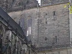 - Ursprünglich sollte der Dom mit zwei Haupttürmen im Westen und zwei korrespondierenden, etwas niedrigeren und schlankeren Türmen im Osten viertürmig sein, doch konzentrierte man sich in den letzten Bauphasen auf die mächtigen Westtürme und ließ die an den Ostseiten beider Querhausarme begonnenen Osttürme, auch Flankentürme genannt, in Höhe der Dachtraufen von Querhaus und Hochchor unvollendet.[10] Eine entsprechende Veränderung der Gewichtung, hin zur schließlich verwirklichten Betonung der Westtürme, ist auch bei mehreren französischen Kathedralen festzustellen, etwa Laon, Chartres und Reims.