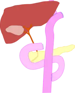 Nach Magenresektion wird das Duodenum blind verschlossen und es wird eine Seit-zu-Endanastomose von der ersten Dünndarmschlinge (Jejunum) und Magenstumpf angelegt (Gastrojejunostomia terminolateralis ante- / retrocolica anterior), wobei die Jejunalschleife ante- oder retrokolisch (vor oder hinter dem horizontalen Teil des Dickdarms) hochgezogen werden kann. Um den kontinuierlichen Kontakt der Gallen- und Duodenalsekrete mit Magenschleimhaut im Bereich der Gastrojejunostomie zu vermeiden, wird zusätzlich eine laterolaterale Enteroanastomose zwischen dem zu- und abführenden Dünndarmschenkel (Braunsche Fußpunktanastomose; im Bild nicht dargestellt) angelegt. Dadurch kann die Rate an Rezidivulzera bzw. Anastomosenulzera gesenkt werden.