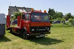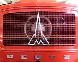 Rundes Klöckner-Deutz-Logo am Kühlergrill eines Feuerwehrfahrzeugs