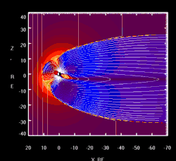 Eine planetare Magnetosphäre wird vor allem durch das vom Sonnenwind getragene Magnetfeld geformt. Der Sonnenwind erreicht in Erdnähe eine Geschwindigkeit von 300 bis 800 km/s und weist eine Dichte von 3 bis 10 Teilchen pro Kubikzentimeter auf. Das interplanetare Magnetfeld (IMF) von etwa 4 Nanotesla enthält ein nahezu stoßfreies Plasma niedriger Dichte. Der Sonnenwind staucht die Magnetosphäre auf der Sonnenseite auf etwa zehn Erdradien (etwa 60.000 km) zusammen und zieht sie auf der Nachtseite zu einem Magnetschweif auseinander, der bis in eine Entfernung von etwa hundert Erdradien (600.000 km) reichen kann. Die Form der Magnetopause ist jedoch nicht statisch, sondern ändert sich zeitlich sehr stark – während der Schweif durch die wechselnde Magnetfeldrichtung des Sonnenwinds (siehe Heliosphärische Stromschicht) regelrecht im Sonnenwind „flattert“, ist die Ausdehnung auf der Tagseite vom Impuls des Sonnenwinds abhängig. In der Simulation (rechtes Bild) treffen die Magnetfeldlinien von links auf das Erdmagnetfeld. In der dargestellten Polarität kommt es zu Rekonnexionen, die die Erdmagnetfeldlinien von links in den Schweifbereich nach rechts abwandern lassen.
