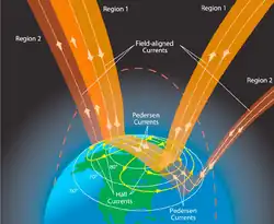 Den Hauptanteil der induzierten Ströme bilden die Birkeland-Ströme (nach Kristian Birkeland, 1867–1917). Sie bestehen aus Elektronen, die sich aufgrund der Lorentzkraft in Spiralen um die vom Nord- zum Südpol verlaufenden Magnetfeldlinien bewegen. Diese Teilchen bewegen sich praktisch stoßfrei in den Strahlungsgürteln (den so genannten Van-Allen-Gürteln) der äußeren Atmosphäre und werden aufgrund der Erhaltung des magnetischen Moments bei Annäherung an die magnetischen Pole reflektiert und bewegen sich wieder auf den anderen Pol zu.