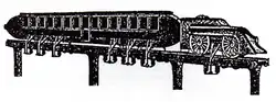 - Im Mai 1998 stellten Forscher am Lawrence Berkeley National Laboratory in Berkeley (Kalifornien) als Nebenprodukt des vorrangig betriebenen Schwungrad-Energiespeicher-Projektes ein völlig neues Magnetschwebebahn-System[28] Inductrack vor, das durch passive in Halbach-Array angeordneten Raum-Temperatur-Permanentmagneten aus neuartigen Legierungen charakterisiert ist und damit wesentlich kostengünstiger, energieeffizienter und wirtschaftlicher sei als alle übrigen Magnetschwebesysteme.[29][30] Fährt der Zug, induziert er durch seine Bewegung ein abstoßendes Magnetfeld und schwebt über dem Gleiskörper. Wie das EDS JR-Maglev soll Inductrack mit Hilfsrädern ausgestattet und beispielsweise von einem Propeller bzw. im weiterentwickelten Inductrack II mit dualem Halbach-Array per elektromagnetischen Impuls angetrieben werden. Dieses System soll später nicht nur wirtschaftlichere Magnetschwebebahnen, sondern auch kostensenkende Raketenstartvorrichtungen ermöglichen. Studien der NASA zeigen, dass durch Beschleunigen einer großen Rakete mit Hilfe eines weiterentwickelten Inductrack auf Mach 0,8 ca. 30–40 % Raketentreibstoff eingespart und entsprechend die Nutzlast vergrößert oder die Rakete verkleinert werden könnte.[31]
