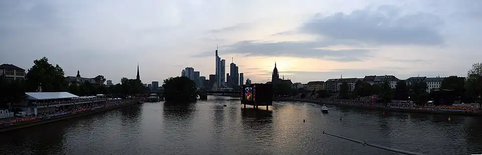 Die Flächen für den Main wurden im Osthafen zusammengesetzt und dann an ihren eigentlichen Standort bei Main-km 35,83 zwischen der Alten Brücke und der Ignatz-Bubis-Brücke verschifft. So konnten beide Mainufer während der WM-Spiele als Public-Viewing-Flächen genutzt werden. Die künstliche Insel stammte aus Rotterdam und wurde dort von einem der WM-Sponsoren, dem niederländischen Technologiekonzern Philips hergestellt. Sie wog mit Bildschirmen und allen Kabeln 350 Tonnen. Dadurch sanken die vier Pfeiler während der Weltmeisterschaft um bis zu sechs Meter tief ins Flusssediment ab.