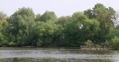 Durch die steigenden Anforderungen der Schifffahrt kam es Mitte des 19. Jahrhunderts zu einer Mittelwasserkorrektion mit dem Ziel einer Mindestfahrwassertiefe von 90 cm und einer Fahrrinnenbreite von 26 m. In den Fluss weisende Buhnen engten das Flussbett ein und erhöhten den Wasserstand,[2] aber auch die Fließgeschwindigkeit in der Flussmitte. Dadurch wurden Sedimente am Grund des Flussbetts abgetragen, während sich gleichzeitig Sedimentablagerungen im Bereich der Buhnenfelder mit langsamer Fließgeschwindigkeit ablagerten. Die für das Treideln benötigten Leinpfade am Ufer wurden befestigt. Da die Schiffe an langen Seilen von Pferden gezogen wurden, gab es zwischen Ufer und Leinpfad keinen höheren Bewuchs. Aus ökologischer Sicht bedeutete die Mittelwasserkorrektion bereits erste signifikante Veränderungen der Uferlandschaft.[3]
