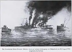 Am Morgen des 28. August 1914 griffen britische Verbände die deutsche Bewacherkette vor Helgoland an. Die Mainz erhielt Befehl, zur Unterstützung auszulaufen, und verließ gegen 09:20 Uhr die Reede von Borkum. Die deutschen Schlachtkreuzer lagen zu dieser Zeit hinter der Barre der Innenjade, und da der Wasserstand noch zu niedrig war, konnten sie erst später auslaufen und somit nicht mehr in das Kampfgeschehen eingreifen.