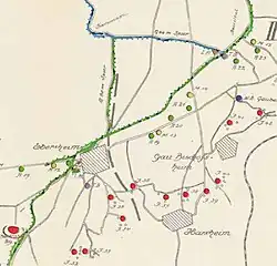 Der Major und Ingenieuroffizier vom Platz Quassowski erstellte Grundrisse und Querschnittszeichnungen im Maßstab 1:1000, auf deren Verlauf der Militärbahn endgültig festgelegt wurde: Die Feldbahn verlief ab Hechtsheim entlang der Ostseite der Ringstraße (Militärringstraße), bog dann im rechten Winkel in die Militärstraße ab und folgte dieser nach Westen bis zu einer Gabelung am Grasweg nördlich von Ebersheim: Eine Bahnstrecke verlief nach Süden Richtung Ebersheim und Zornheim und die andere über Franzosendell, Hechtsheimer Berg, Ober-Olmer Wald und Wackernheim zum Rabenkopf.[2][3][4][5]
