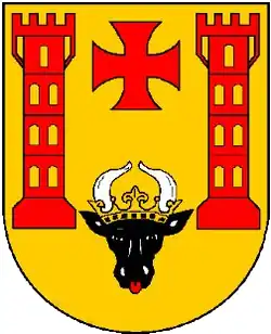 | Blasonierung: „In Gold zwischen zwei schwebenden roten Türmen mit je vierfach gezinnter, beiderseits abgestützter Platte und sieben (1:2:2:2) betagleuchteten Fenstern, ein hersehender, golden gekrönter schwarzer Stierkopf mit geschlossenem Maul, ausgeschlagener roter Zunge und silbernen Hörnern, überhöht von einem roten Tatzenkreuz.“[24] | |