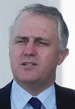 Malcolm Bligh Turnbull AC (* 24. Oktober 1954 in Sydney) ist ein australischer Politiker der konservativen Liberal Party of Australia. Er war vom 15. September 2015 bis zum 24. August 2018[1] Premierminister von Australien. Der vormalige Rechtsanwalt und Investmentbanker war zuletzt von September 2013 bis September 2015 Minister für das Fernmeldewesen unter Premierminister Tony Abbott. Unter Premierminister John Howard diente er von Januar zu dessen Abwahl im Dezember 2007 als Umweltminister. Anschließend war er zunächst Schattenminister für Finanzen und von September 2008 bis Dezember 2009 Oppositionsführer. Nachdem Premierminister Tony Abbott in ein Popularitätstief geraten war, wurde Turnbull, seit langem Abbotts innerparteilicher Widersacher, in einer Kampfabstimmung am 14. September 2015 an Abbotts Stelle zum Parteivorsitzenden der Liberalen Partei gewählt. Am Tag darauf wurde er auch als Premierminister vereidigt.[2]